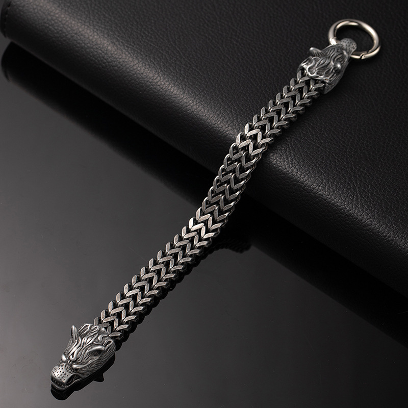 This accessory is a Alpha beast steel bracelet, a piece of jewelry that blends ancient Norse symbolism with modern punk and biker aesthetics. It features a heavy, thick chain design often referred to as a mesh, keel, or woven link chain, providing a rugged and substantial feel on the wrist.